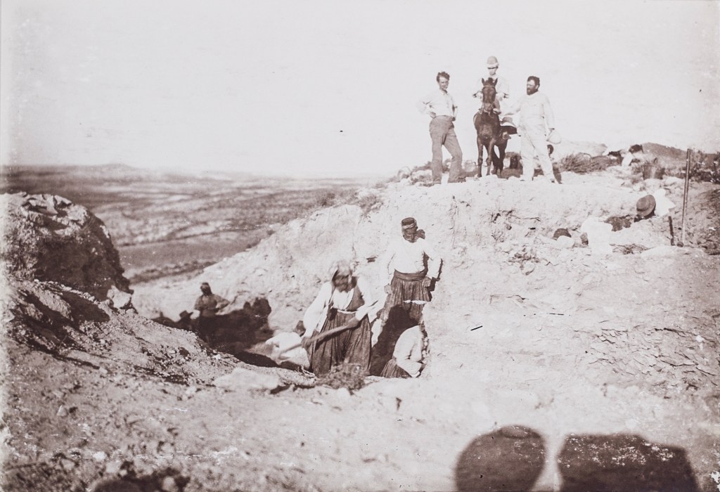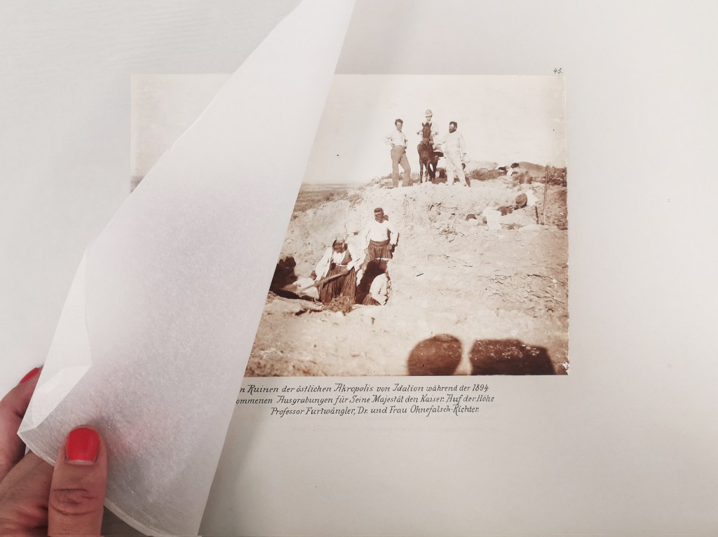 Figure 3: Caption under the photograph reads: “On the ruins of the Eastern acropolis of Idalion during the excavations carried out in 1894 for His Majesty the Emperor. On the hill, Professor Furtwängler, Dr. and Mrs. Ohnefalsch-Richter.” From the original album “Studies in Cyprus” by Magda and Max Ohnefalsch-Richter, 1895, Cultural Foundation of the Bank of Cyprus, photograph by the author.